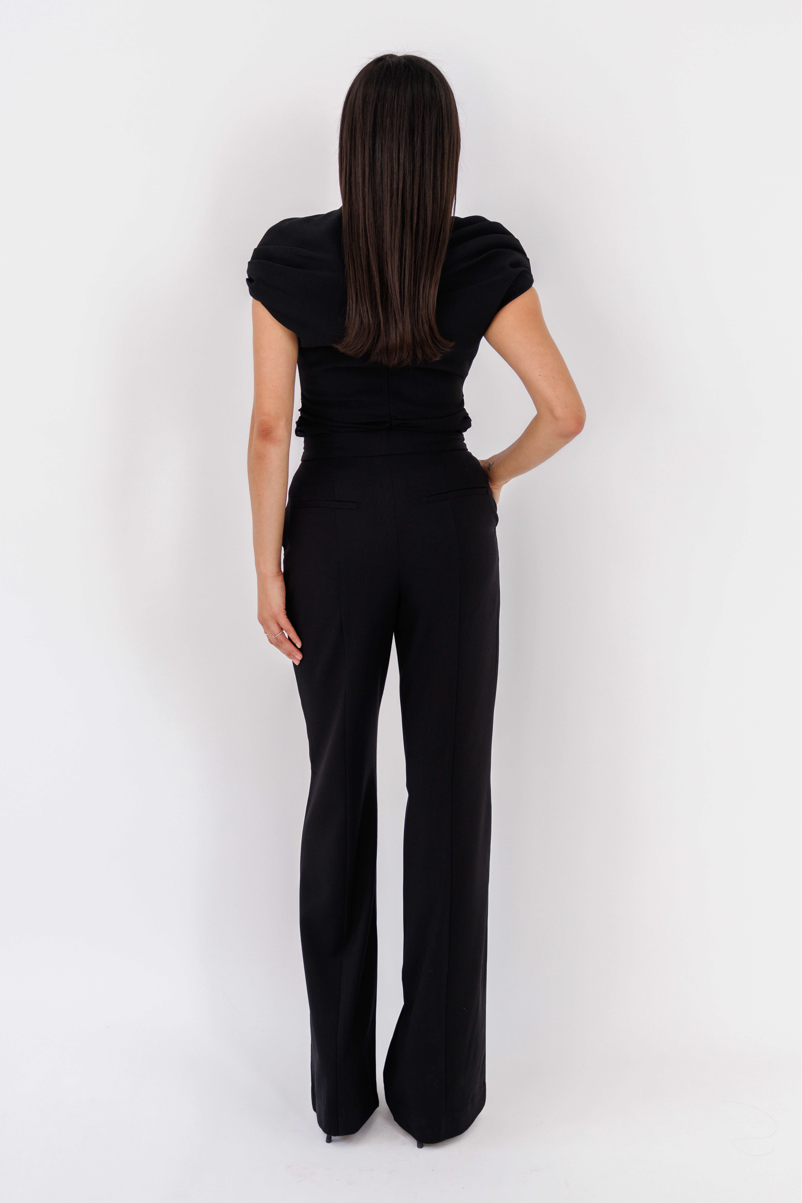 Effortlessly elegant, the Eva top in black has a caplet sleeve and features soft draped detailing cascading from the shoulders for a flattering fluid look. This is combined with a cinched, ruched waisted to define the silhouette, perfect for day to night.