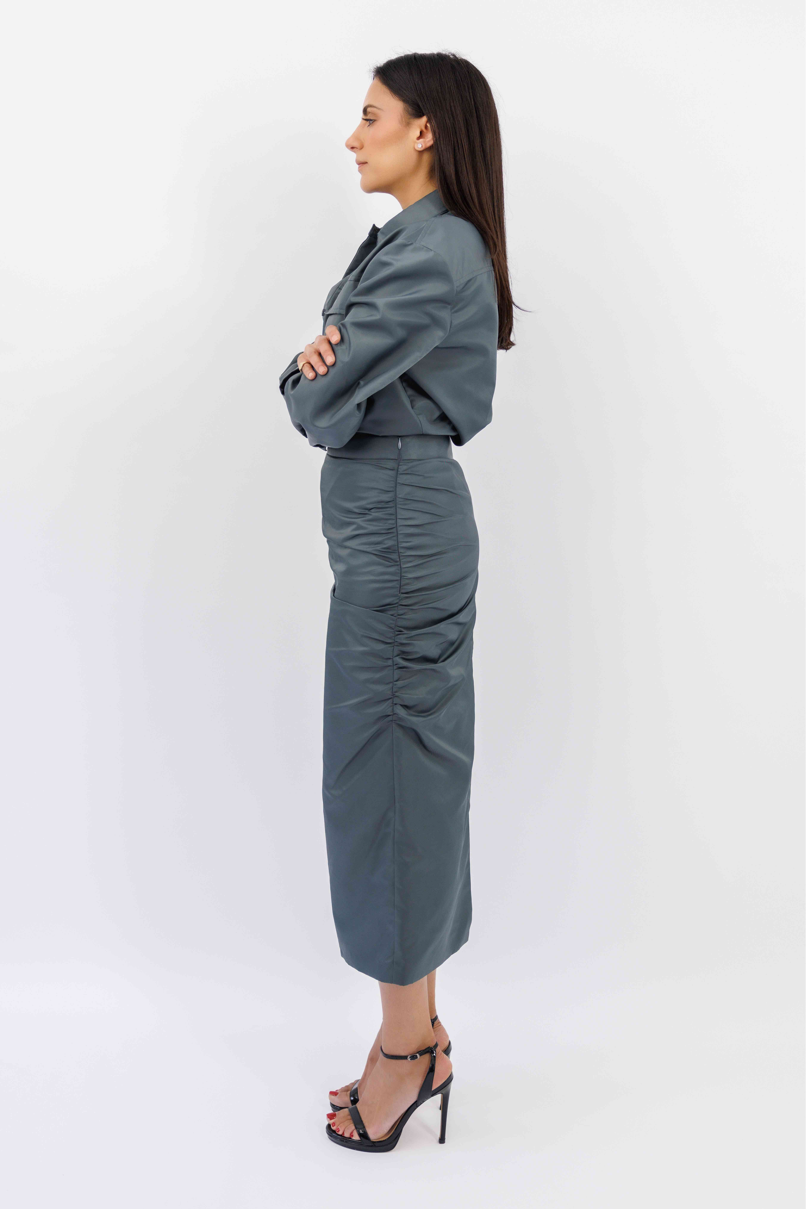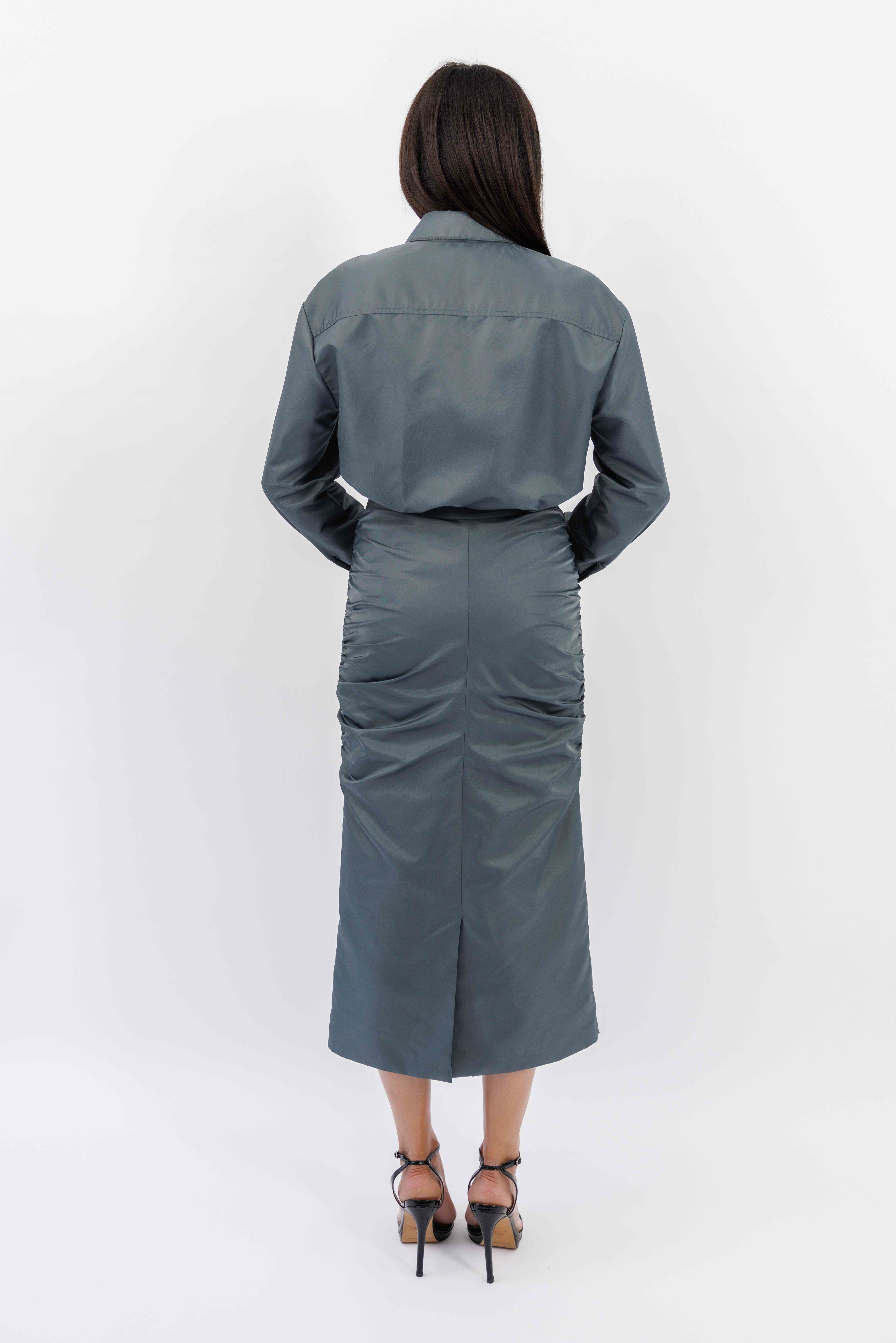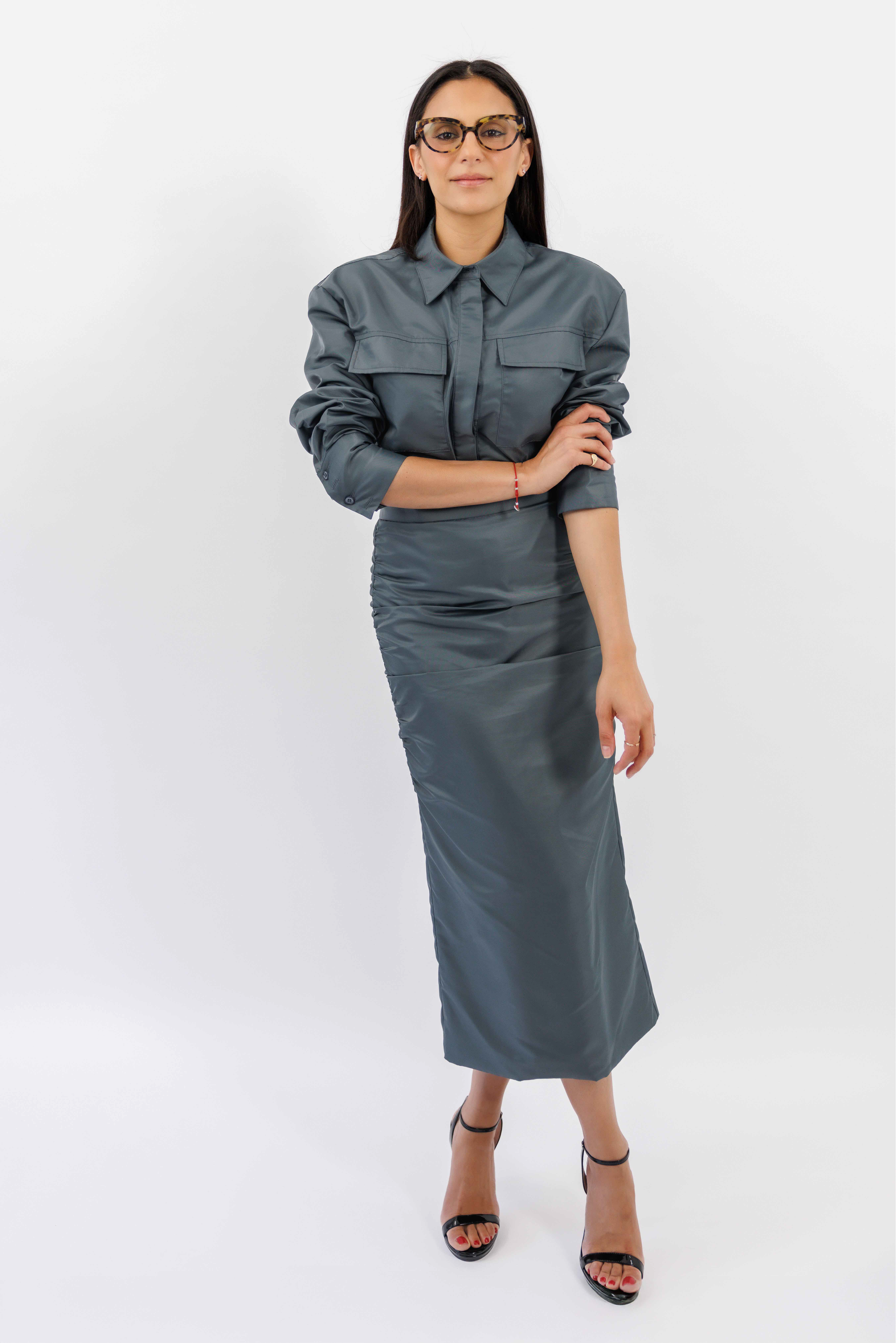 The Gigi Shirt is a relaxed fit wet-look military-inspired top that fuses precision tailoring with avant-garde allure.