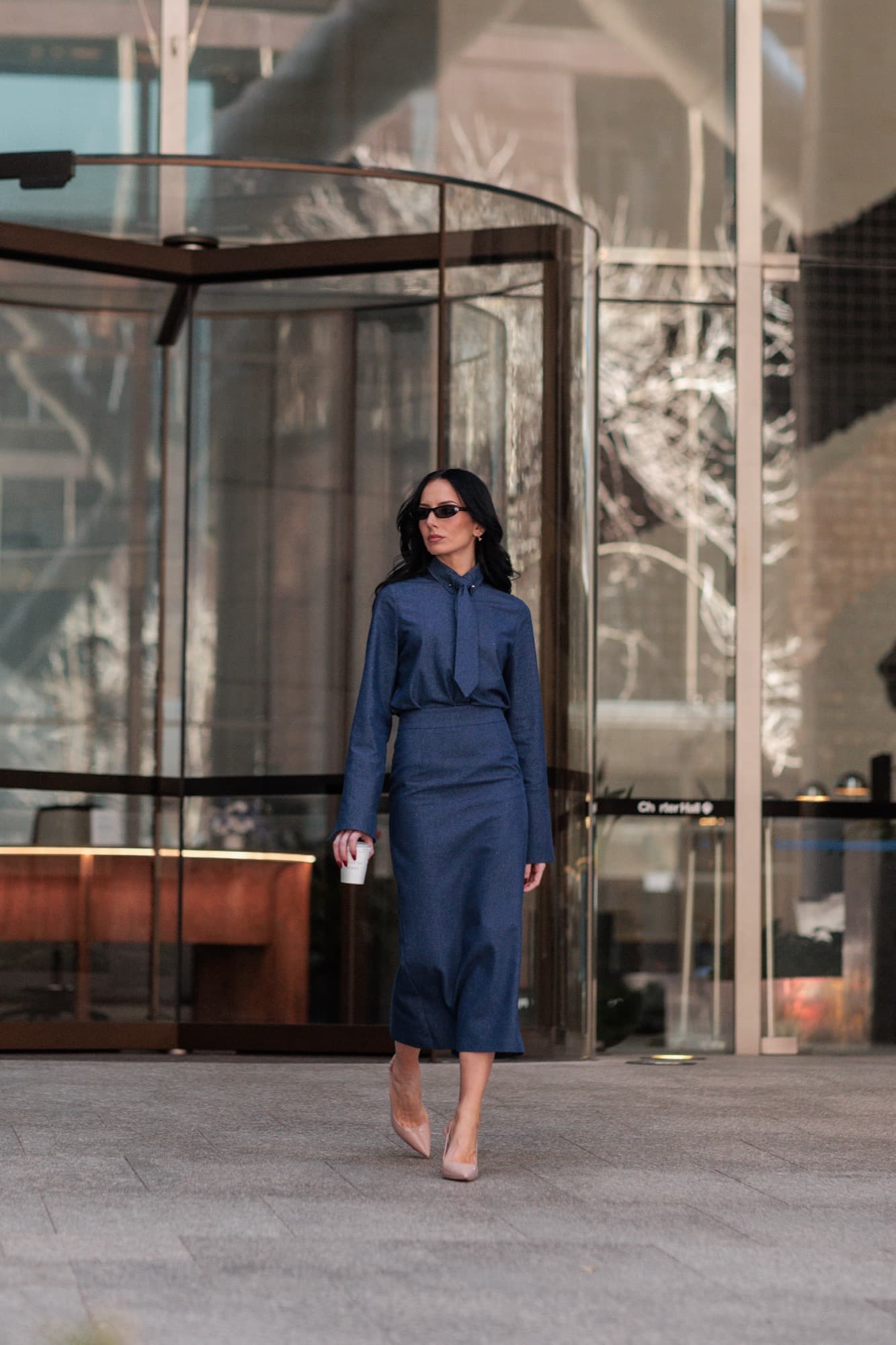 The Kendall Shirt in navy perfectly combines femininity and masculinity. It features the SELPH signature collar pin and exaggerated cuff detail with cuff hardware. In addition, this piece comes with a matching tie, all in our textured fabric, it’s a powerful statement for everyday life.