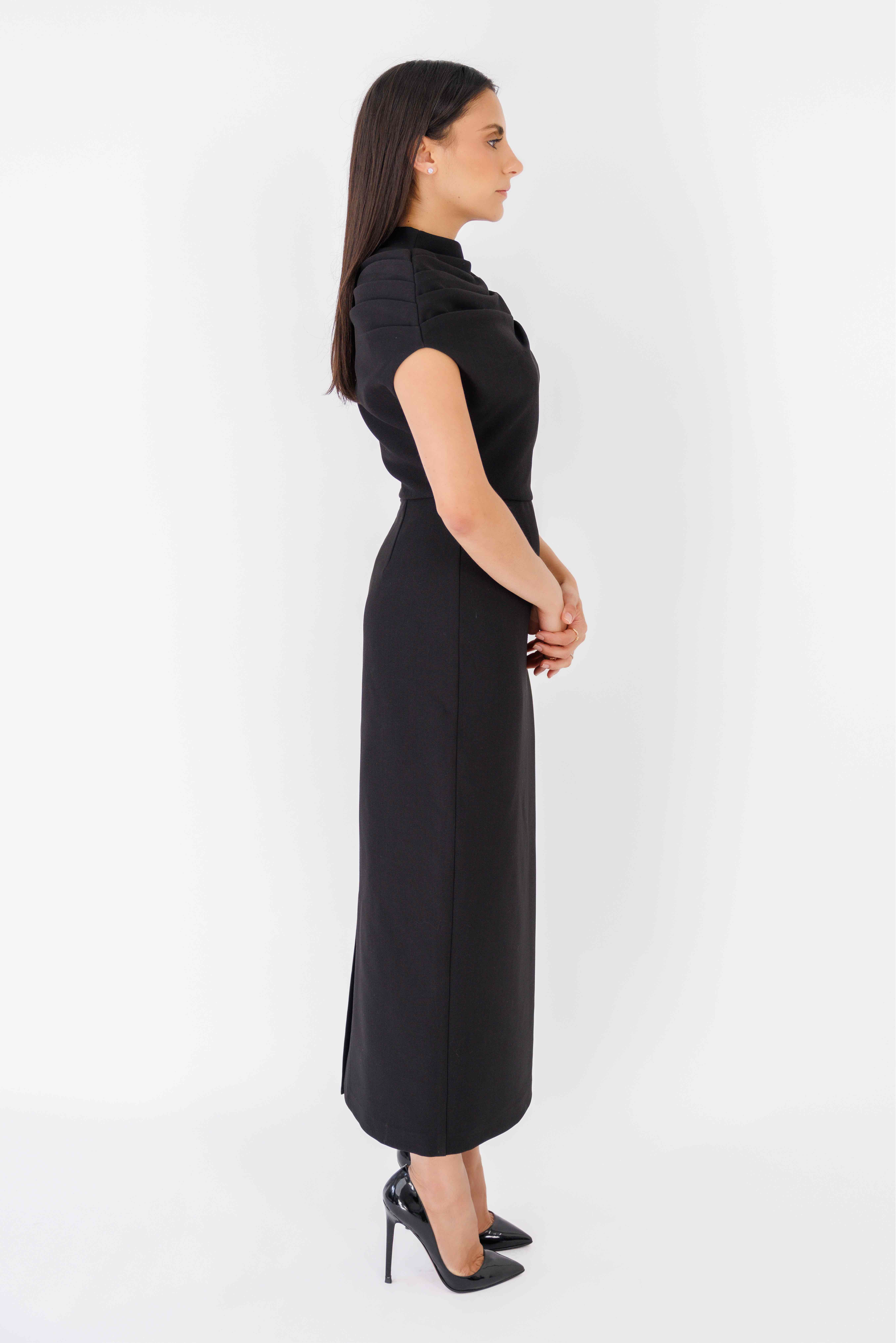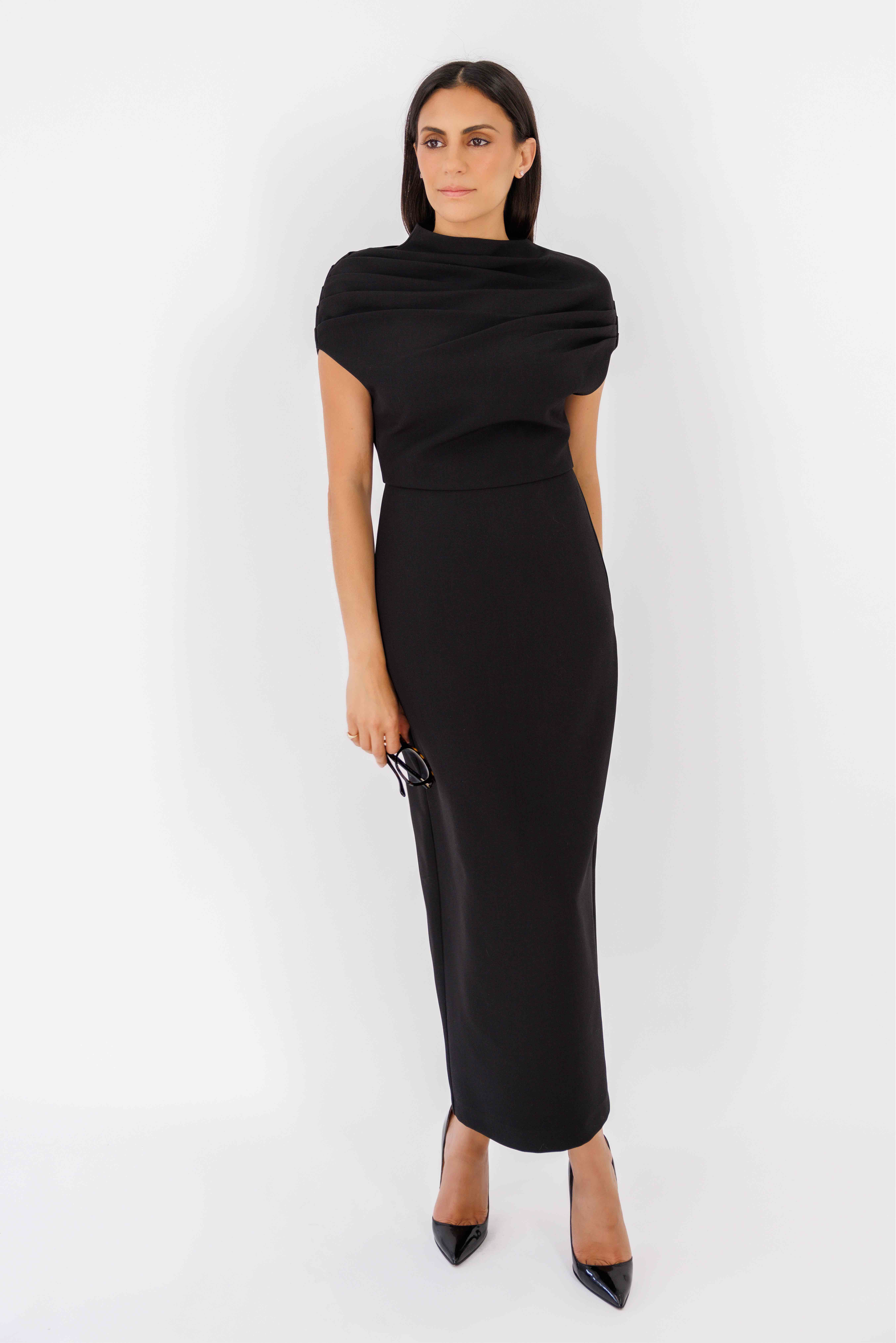 The Phillipa Dress is a draped crepe caplet midi dress that perfectly balances timeless elegance and modern sophistication. Featuring a refined high neckline, detailed bodice, sleek lines and fitted silhouette to flatter every curve.